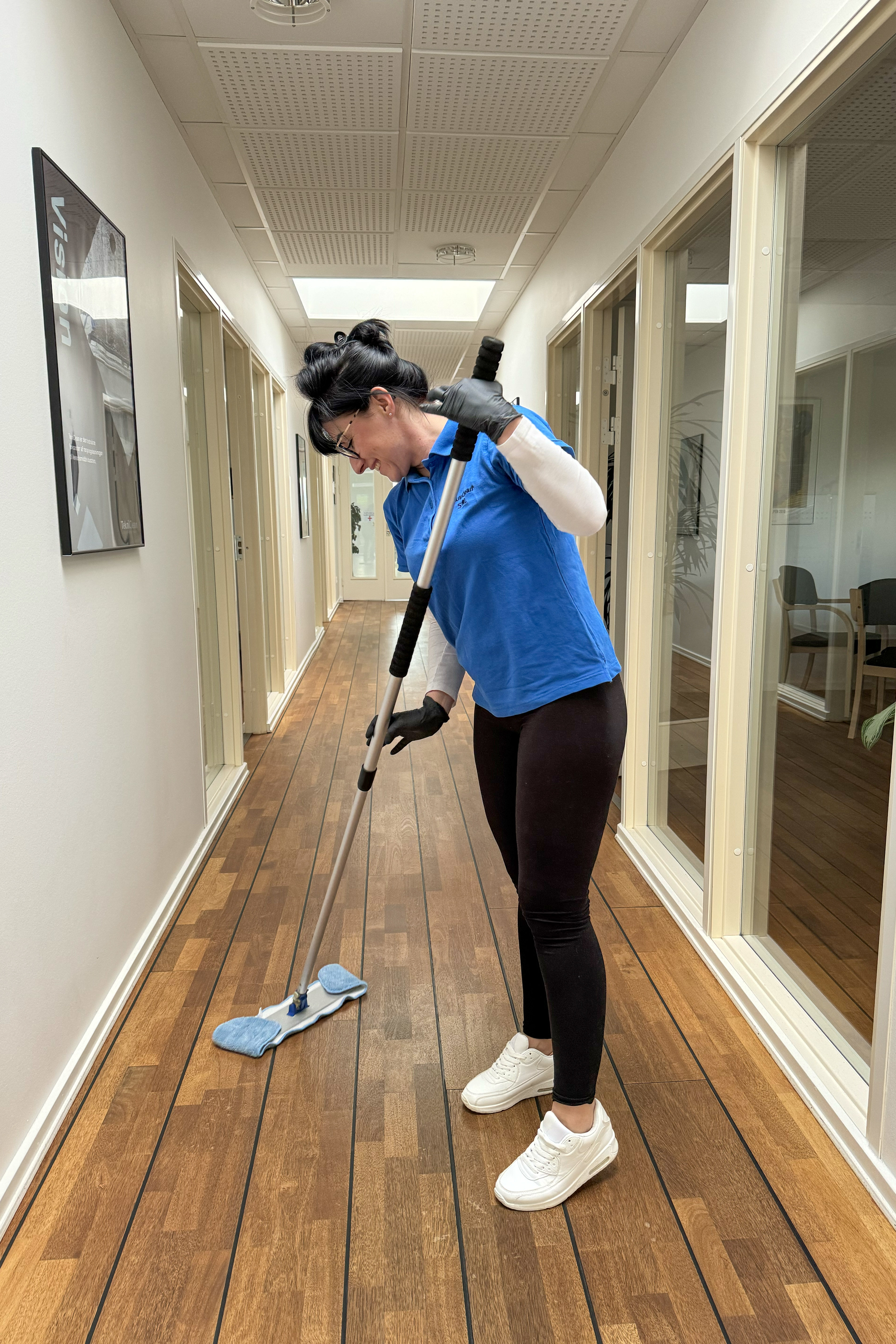 Jeg vasker gulve, tørrer borde af, fjerner affald og gør toiletterne rene. Alt hvad der hører ind under traditionel rengøring, tager jeg mig.
