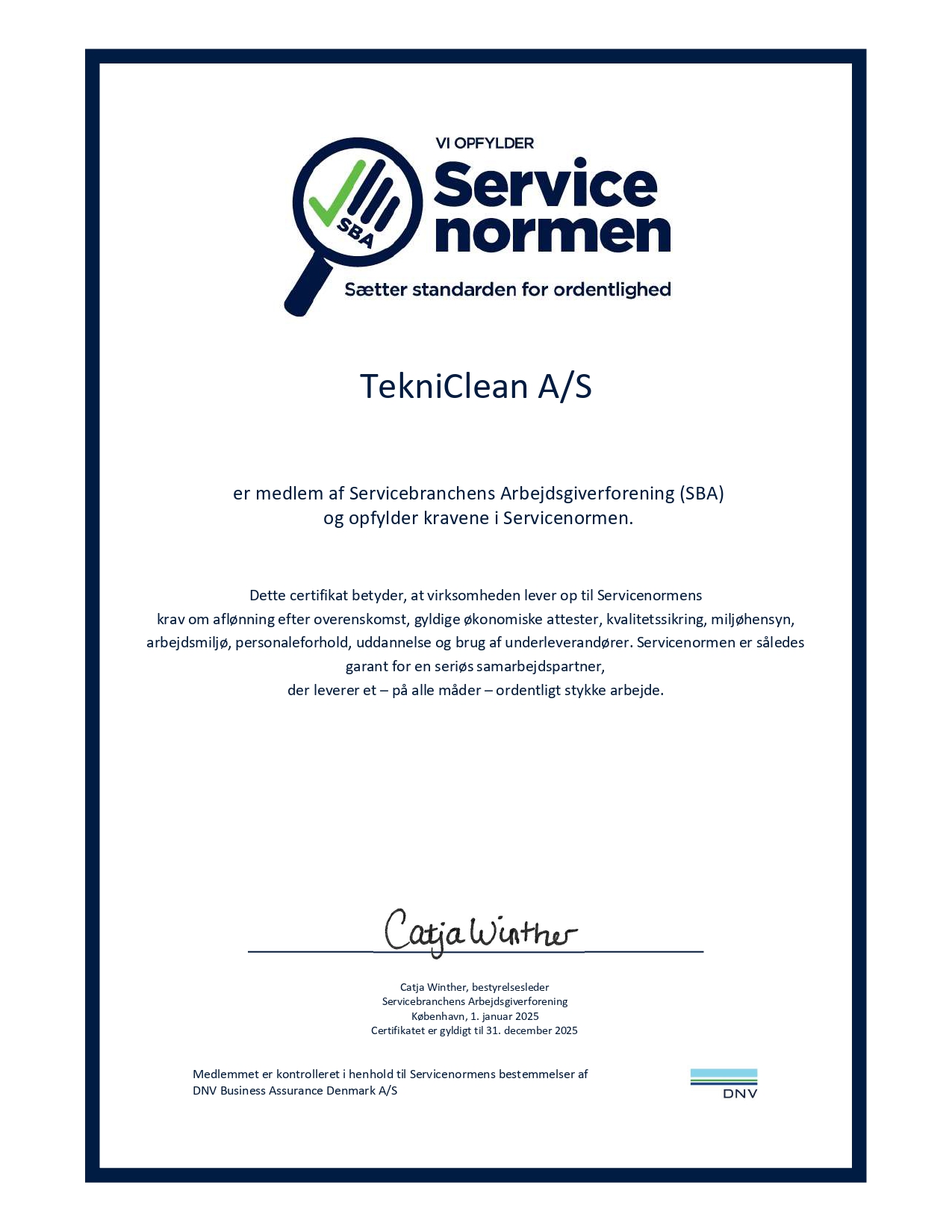 Servicenormen er en garantimærkning, som udelukkende tildeles medlemmer af Servicebranchens Arbejdsgiverforening (SBA). Vi opfylder branchens strengeste krav omkring økonomiske attester, kvalitetsniveau, miljøhensyn, arbejdsmiljø, personaleforhold, uddannelse og underleverandører. Det norske Veritas (DNV) kontrollerer løbende, at samtlige krav bliver overholdt. Servicenormen er altså din garanti for en seriøs samarbejdspartner, der leverer et – på alle måder – ordentligt stykke arbejde.